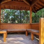 Няколко стъпала ни отвеждат до Беседката за съзерцание, от която умишлено няма гледка, за разлика от другите пейки и места за отдих. Тя предлага усамотение, от което се възползваме, за да направим кратка медитация.