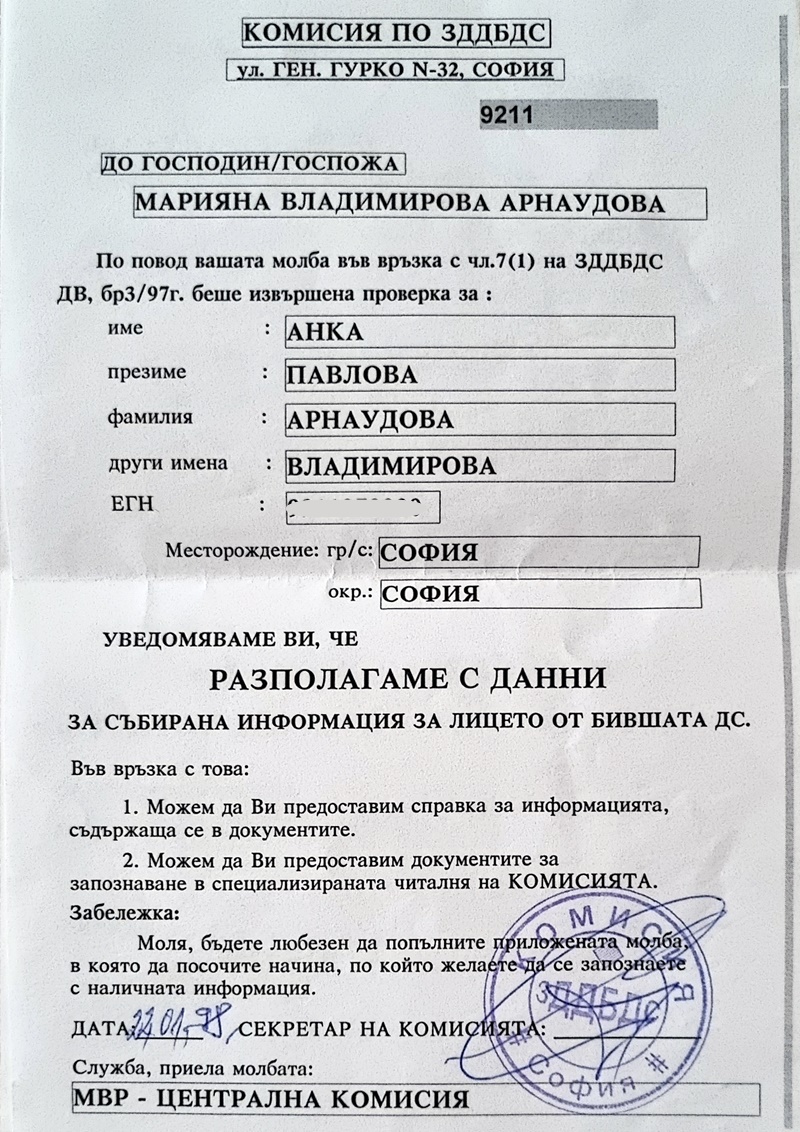 По-късно разбрахме, че Държавна сигурност (ДС) се е опитала да вербува майка ни като агент. (виж фотогалерия) Пуснахме молба в Комисията по досиетата и научихме, че майка ни има досие. Четох го. Две години я мъчат да каже нещо, и накрая се отказват. Заключението е, че „този сътрудник не върши работа“. В своите доклади майка ми е писала само, че много се обичат със съседите.